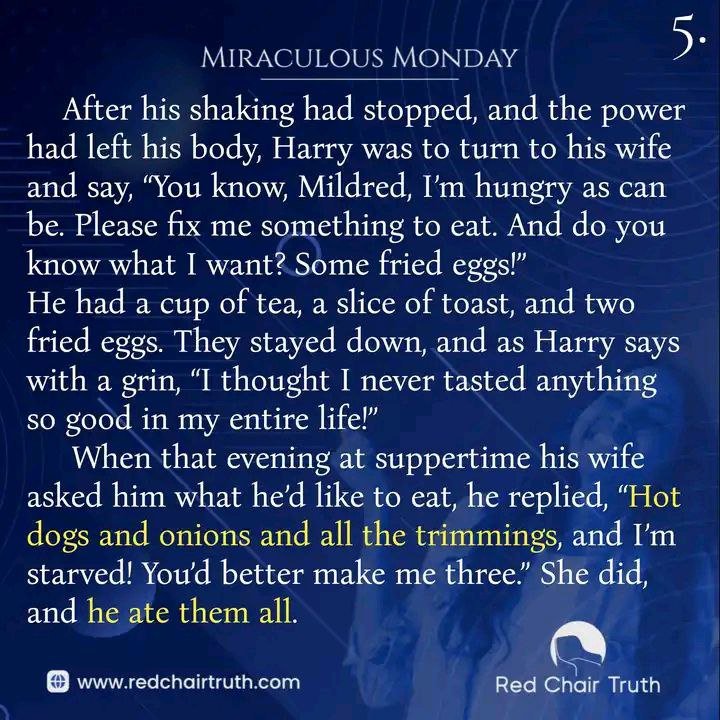 After his shaking had stopped, and the power had left his body, Harry was to turn to his wife and say, “You know, Mildred, I’m hungry as can be. Please fix me something to eat. And do you know what I want? Some fried eggs!”
