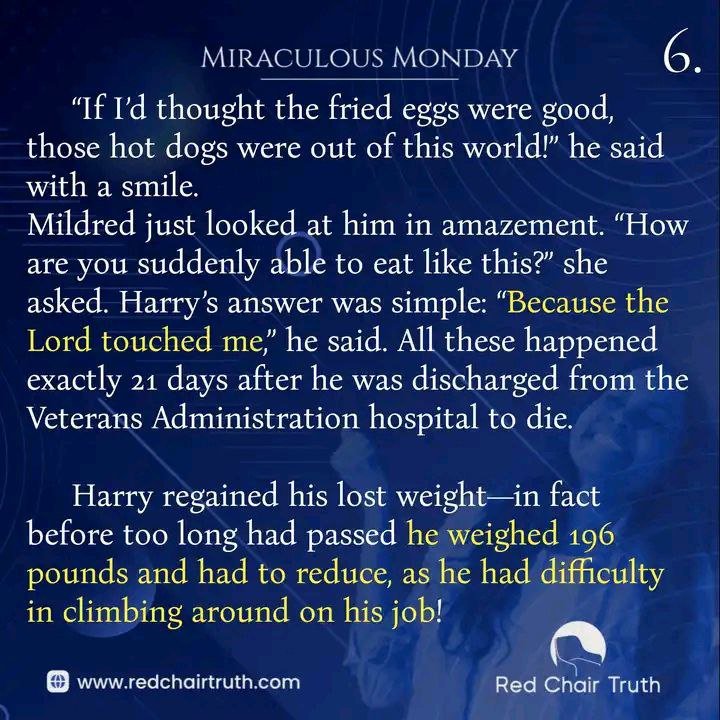 Mildred just looked at him in amazement. “How are you suddenly able to eat like this?” she asked. Harry’s answer was simple: “Because the Lord touched me,” he said.