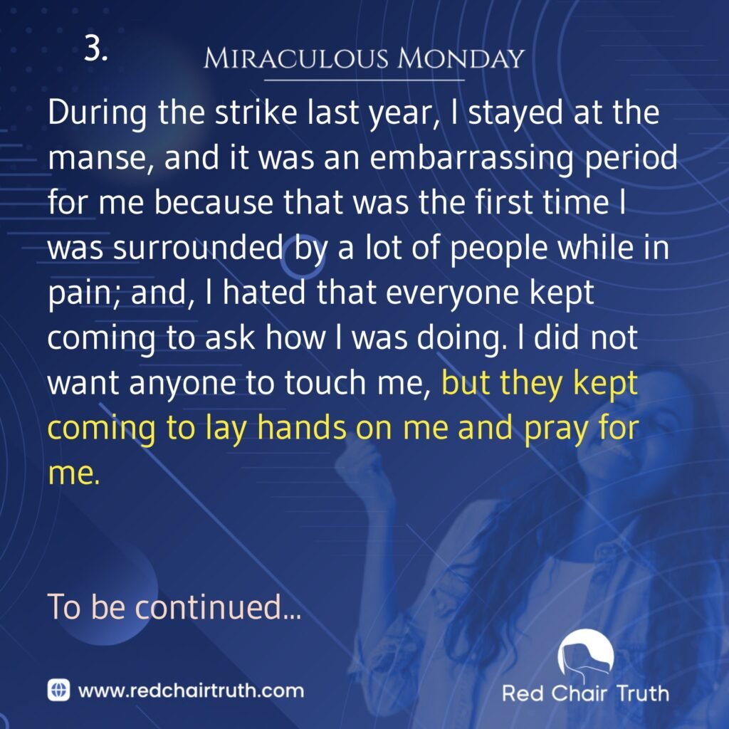 During the strike last year, I stayed at the manse, and it was an embarrassing period for me because that was the first time I was surrounded by a lot of people while in pain; and, I hated that everyone kept coming to ask how I was doing. I did not want anyone to touch me, but they kept coming to lay hands on me and pray for me.