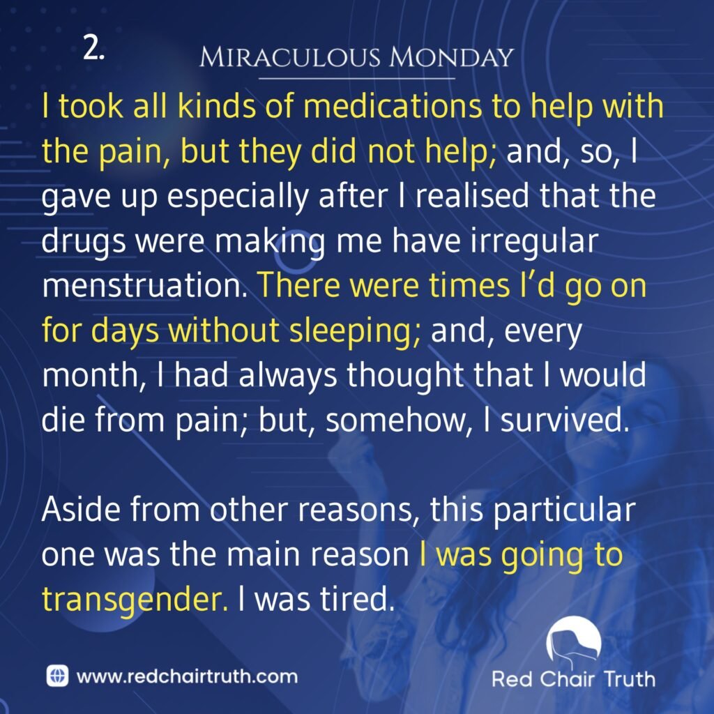 I took all kinds of medications to help with the pain, but they did not help; and, so, I gave up especially after I realised that the drugs were making me have irregular menstruation. There were times I’d go on for days without sleeping; and, every month, I had always thought that I would die from pain; but, somehow, I survived. Aside from other reasons, this particular one was the main reason I was going to transgender. I was tired.
