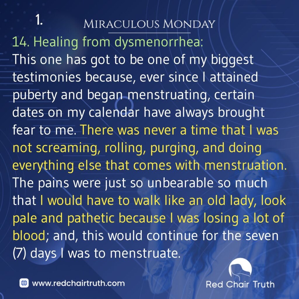 This one has got to be one of my biggest testimonies because, ever since I attained puberty and began menstruating, certain dates on my calendar have always brought fear to me. There was never a time that I was not screaming, rolling, purging, and doing everything else that comes with menstruation. The pains were just so unbearable so much that I would have to walk like an old lady, look pale and pathetic because I was losing a lot of blood; and, this would continue for the seven (7) days I was to menstruate.
