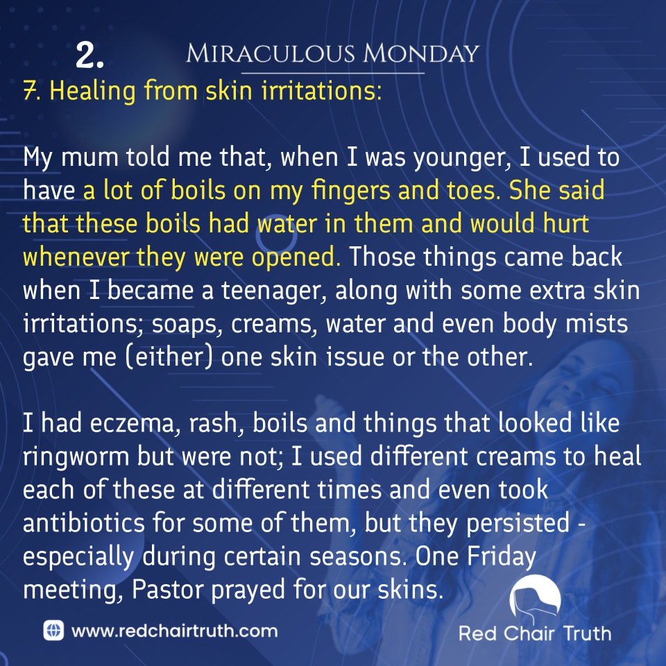 One Friday meeting, Pastor prayed for our skins. He asked for restoration and healing from every kind of reaction; to be honest, I thought it was a weird prayer — Pastor was mentioning some skin irritations that I had. Before that day, I did not believe that prayers were needed for these kinds of issues — I thought I just needed to find the perfect cream for my skin, and stay away from certain detergents and soaps.