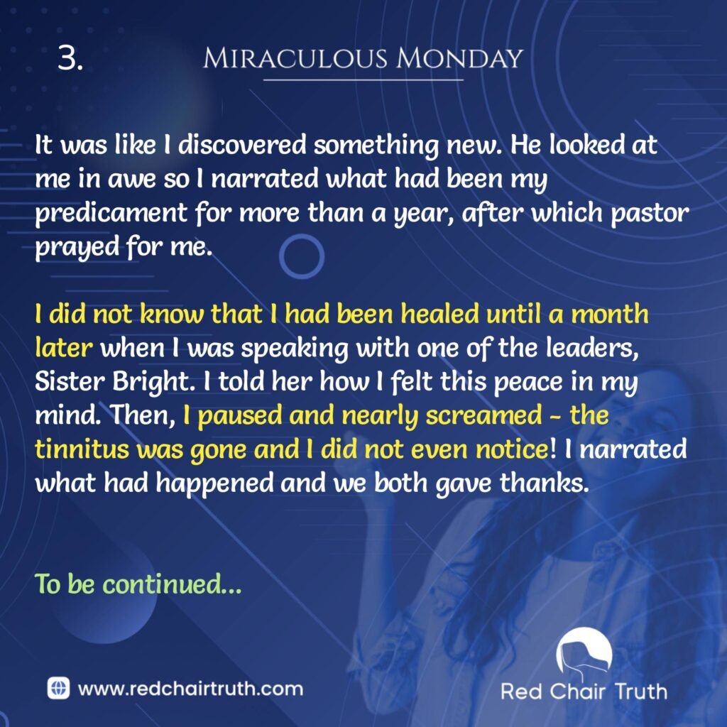 Then, sometime in June 2022, I had a meeting with my pastor; and, after the meeting, he asked if I had anything that was bothering me. I told him that I did not. I had totally forgotten that I had tinnitus. I had learnt to live with the pain – a skill I had acquired over the years. Pastor asked if I was sure and I responded in the positive. It was not until I was about to leave that I remembered; so, I immediately turned and said, “Sir, I have tinnitus!”