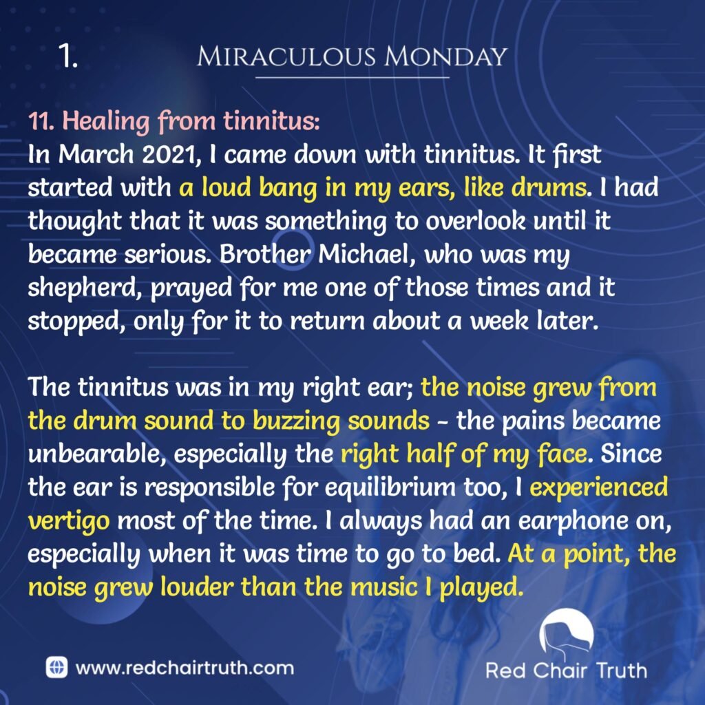In March 2021, I came down with tinnitus. It first started with a loud bang in my ears, like drums. I had thought that it was something to overlook until it became serious. Brother Michael, who was my shepherd, prayed for me one of those times and it stopped, only for it to return about a week later.
