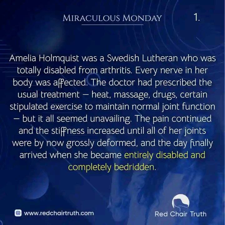Amelia Holmquist was a Swedish Lutheran who was totally disabled from arthritis. Every nerve in her body was affected. The doctor had prescribed the usual treatment—heat, massage, drugs, certain stipulated exercise to maintain normal joint function—but it all seemed unavailing. The pain continued and the stiffness increased until all of her joints were by now grossly deformed, and the day finally arrived when she became entirely disabled and completely bedridden.