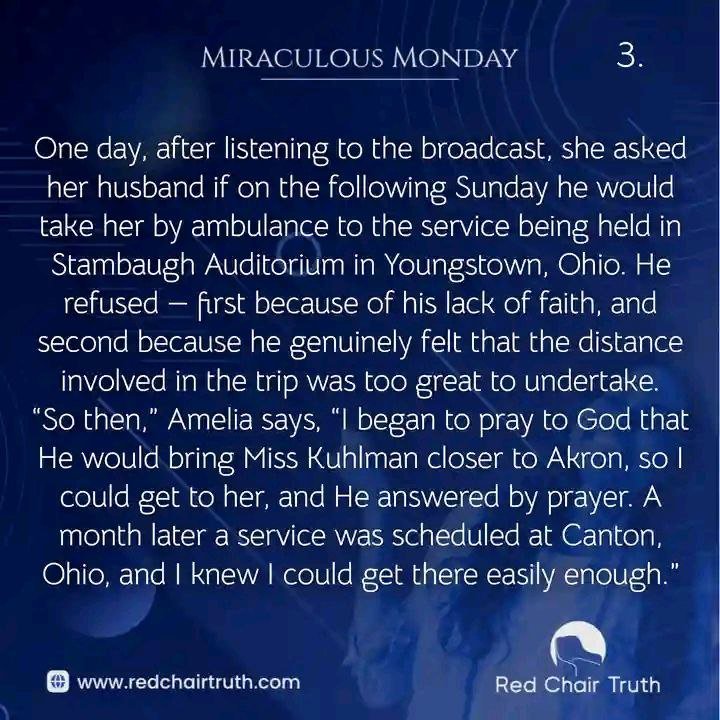 One day, after listening to the broadcast, she asked her husband if on the following Sunday he would take her by ambulance to the service being held in Stambaugh Auditorium in Youngstown, Ohio. He refused—first because of his lack of faith, and second because he genuinely felt that the distance involved in the trip was too great to undertake. “So then,” Amelia says, “I began to pray to God that He would bring Miss Kuhlman closer to Akron, so I could get to her, and He answered my prayer. A month later a service was scheduled at Canton, Ohio, and I knew I could get there easily enough.”