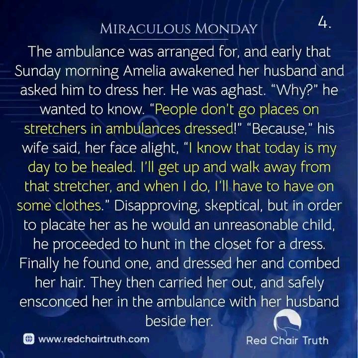“Because,” his wife said, her face alight, “I know that today is my day to be healed. I’ll get up and walk away from that stretcher, and when I do, I’ll have to have on some clothes.” Disapproving, skeptical, but in order to placate her as he would an unreasonable child, he proceeded to hunt in the closet for a dress. Finally he found one, dressed her, and combed her hair. They then carried her out and safely ensconced her in the ambulance with her husband beside her.