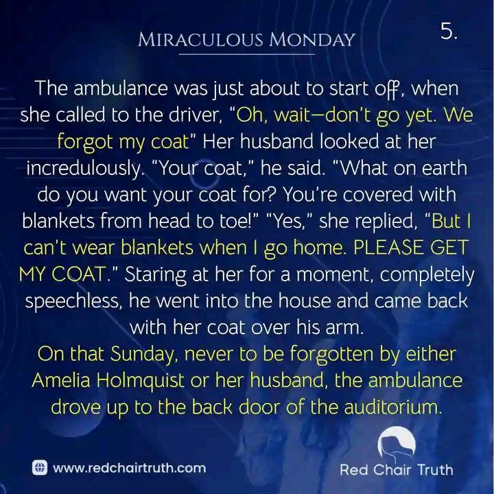 On that Sunday, never to be forgotten by either Amelia Holmquist or her husband, the ambulance drove up to the back door of the auditorium.
