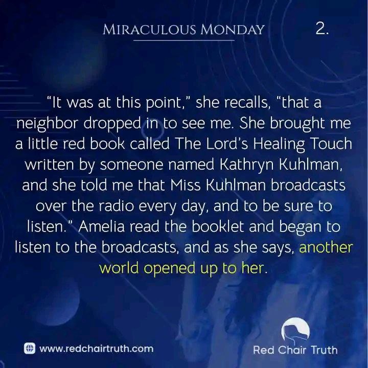 “It was at this point,” she recalls, “that a neighbor dropped in to see me. She brought me a little red book called The Lord’s Healing Touch written by someone named Kathryn Kuhlman, and she told me that Miss Kuhlman broadcasts over the radio every day, and to be sure to listen.” Amelia read the booklet and began to listen to the broadcasts, and as she says, another world opened up to her.