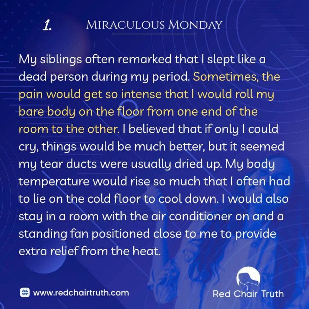 My siblings often remarked that I slept like a dead person during my period. Sometimes, the pain would get so intense that I would roll my bare body on the floor from one end of the room to the other. I believed that if only I could cry, things would be much better, but it seemed my tear ducts were usually dried up. My body temperature would rise so much that I often had to lie on the cold floor to cool down. I would also stay in a room with the air conditioner on and a standing fan positioned close to me to provide extra relief from the heat.
