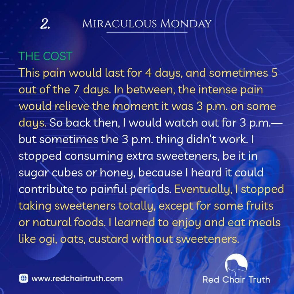 This pain would last for 4 days, and sometimes 5 out of the 7 days. In between, the intense pain would relieve the moment it was 3 p.m. on some days. So back then, I would watch out for 3 p.m., but sometimes the 3 p.m. thing didn’t work. I stopped consuming extra sweeteners, be it in sugar cubes or honey, because I heard it could contribute to painful periods. Eventually, I stopped taking sweeteners totally, except for some fruits or natural foods. I learned to enjoy and eat meals like ogi, oats, custard without sweeteners.