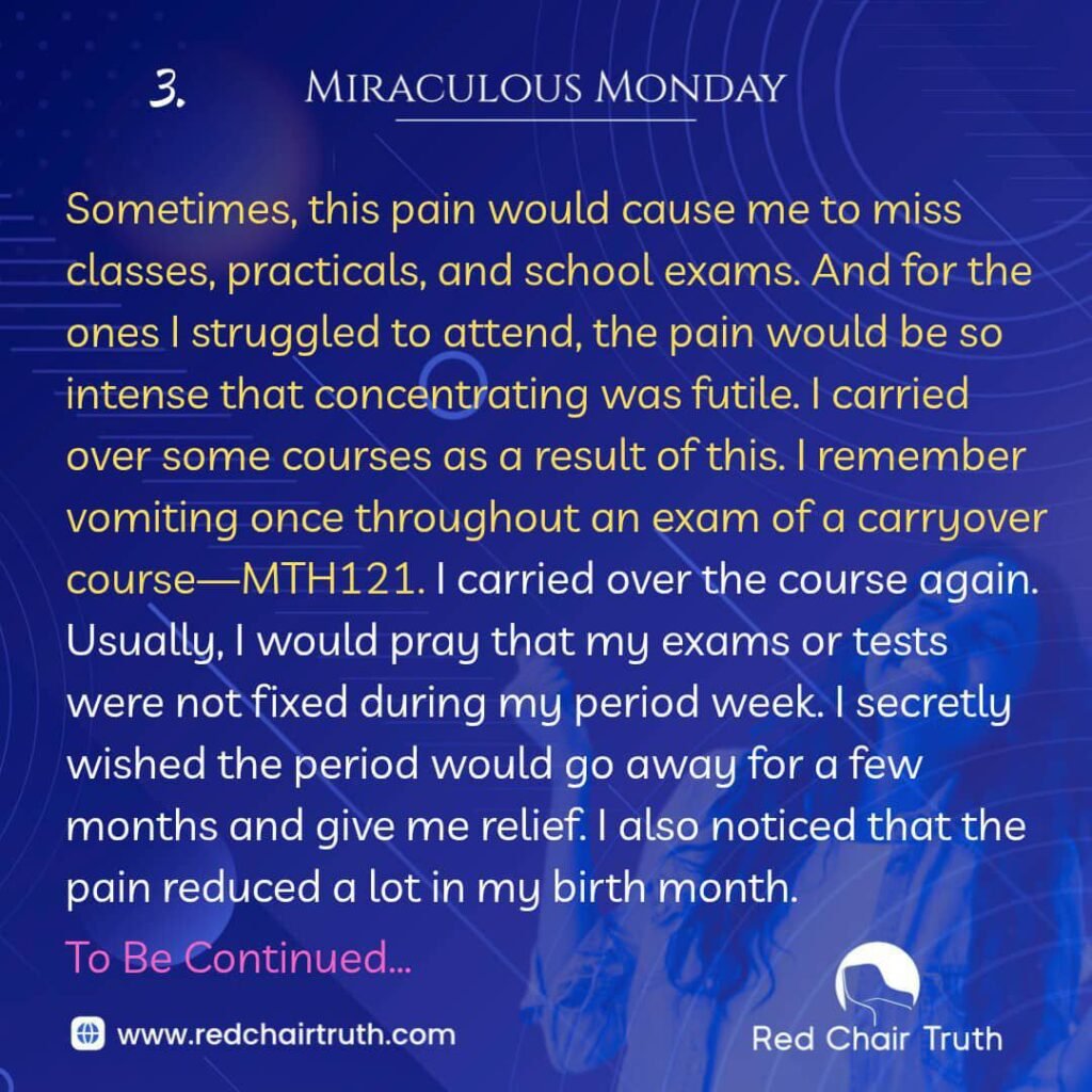 Sometimes, this pain would cause me to miss classes, practicals, and school exams. And for the ones I struggled to attend, the pain would be so intense that concentrating was futile. I carried over some courses as a result of this. I remember vomiting once throughout an exam of a carryover course—MTH121. I carried over the course again. Usually, I would pray that my exams or tests were not fixed during my period week. I secretly wished the period would go away for a few months and give me relief. I also noticed that the pain reduced a lot in my birth month.