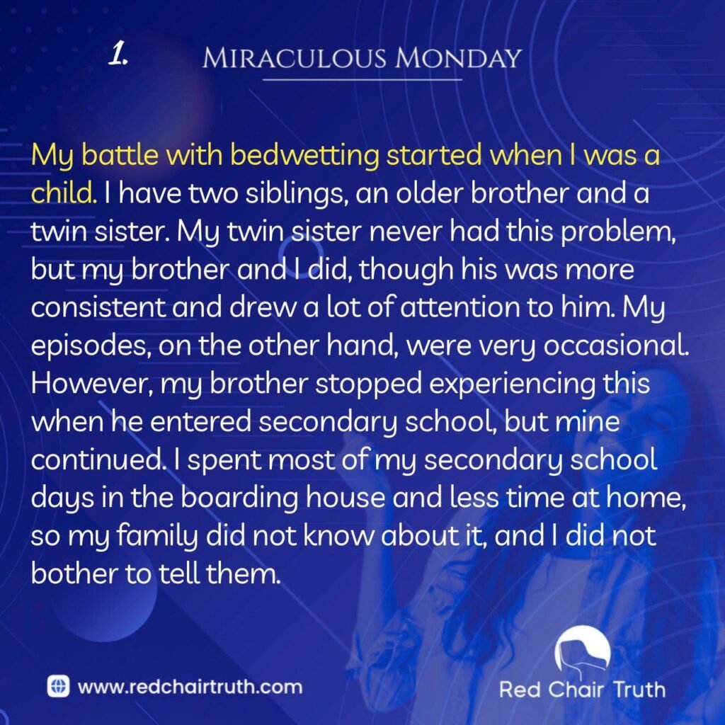 My battle with bedwetting started when I was a child. I have two siblings, an older brother and a twin sister. My twin sister never had this problem, but my brother and I did, though his was more consistent and drew a lot of attention to him. My episodes, on the other hand, were very occasional. However, my brother stopped experiencing this when he entered secondary school, but mine continued. I spent most of my secondary school days in the boarding house and less time at home, so my family did not know about it, and I did not bother to tell them.