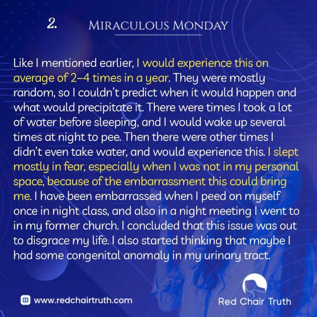 Like I mentioned earlier, I would experience this on average of 2–4 times a year. They were mostly random, so I couldn’t predict when it would happen and what would precipitate it. There were times I took a lot of water before sleeping, and I would wake up several times at night to pee. Then there were other times I didn’t even take water, and would experience this. I slept mostly in fear, especially when I was not in my personal space, because of the usembarrassment this could bring me. I have been embarrassed when I peed on myself once in night class, and also in a night meeting I went to in my former church. I concluded that this issue was out to disgrace my life. I also started thinking that maybe I had some congenital anomaly in my urinary tract.