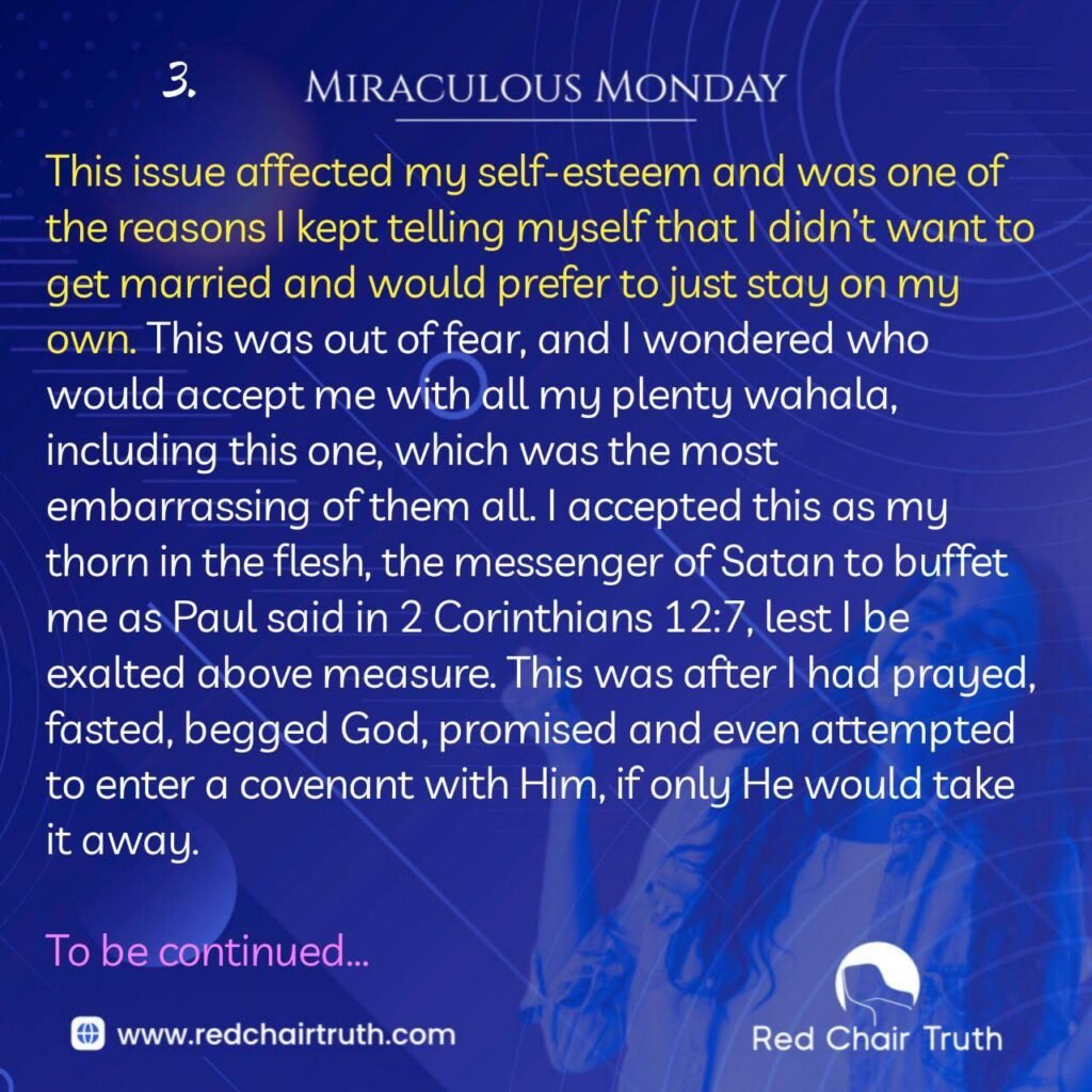 This issue affected my self-esteem and was one of the reasons I kept telling myself that I didn’t want to get married and would prefer to just stay on my own. This was out of fear, and I wondered who would accept me with all my plenty wahala, including this one, which was the most embarrassing of them all. I accepted this as my thorn in the flesh, the messenger of Satan to buffet me as Paul said in 2 Corinthians 12:7, lest I be exalted above measure. This was after I had prayed, fasted, begged God, promised and even attempted to enter a covenant with Him, if only He would take it away.