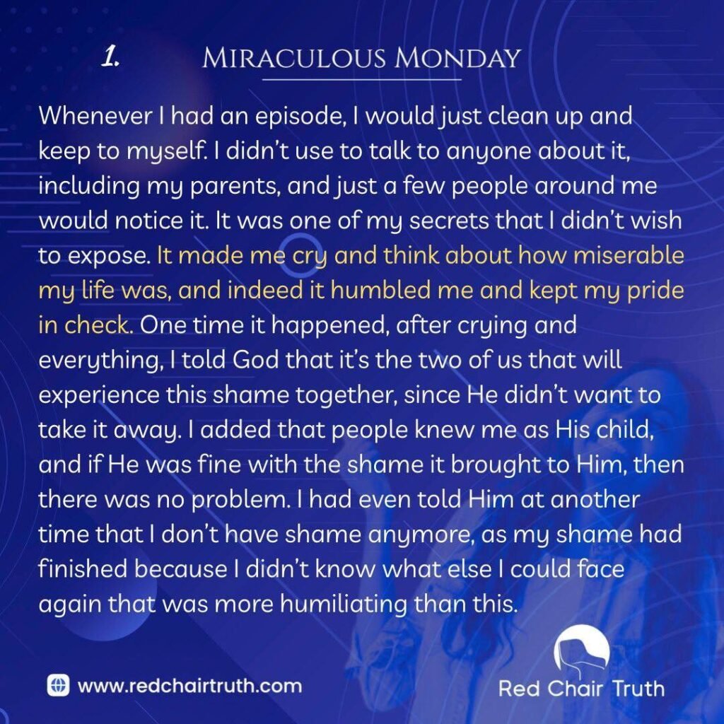 Whenever I had an episode, I would just clean up and keep to myself. I didn’t use to talk to anyone about it, including my parents, and just a few people around me would notice it. It was one of my secrets that I didn’t wish to expose. It made me cry and think about how miserable my life was, and indeed it humbled me and kept my pride in check. One time it happened, after crying and everything, I told God that it’s the two of us that will experience this shame together, since He didn’t want to take it away. I added that people knew me as His child, and if He was fine with the shame it brought to Him, then there was no problem. I had even told Him at another time that I don’t have shame anymore, as my shame had finished because I didn’t know what else I could face again that was more humiliating than this.