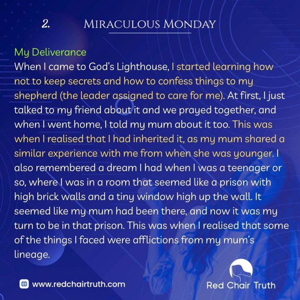 When I came to God’s Lighthouse, I started learning how not to keep secrets and how to confess things to my shepherd (the leader assigned to care for me). At first, I just talked to my friend about it and we prayed together, and when I went home, I told my mum about it too. This was when I realised that I had inherited it, as my mum shared a similar experience with me from when she was younger. I also remembered a dream I had when I was a teenager or so, where I was in a room that seemed like a prison with high brick walls and a tiny window high up the wall. It seemed like my mum had been there, and now it was my turn to be in that prison. This was when I realised that some of the things I faced were afflictions from my mum’s lineage.