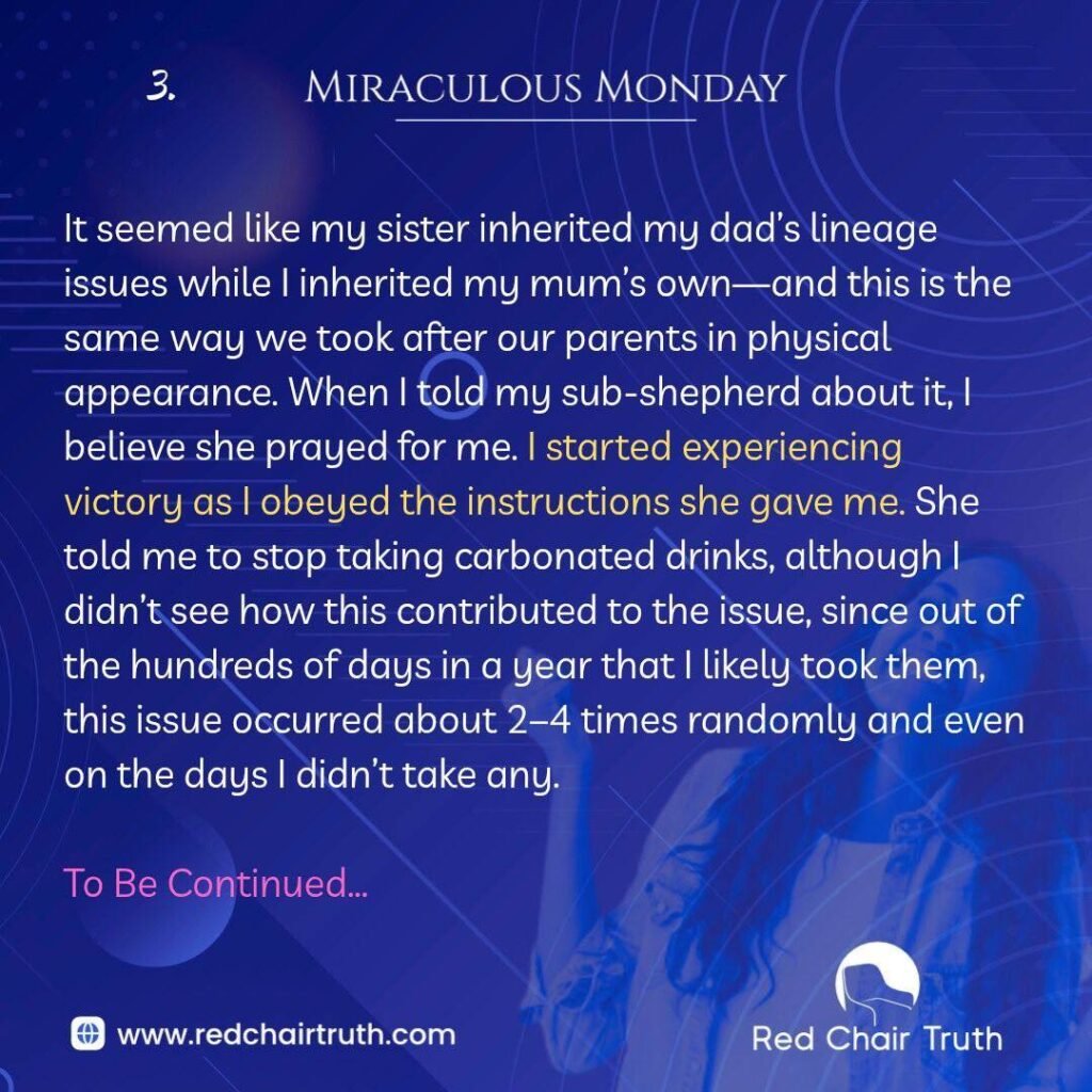 It seemed like my sister inherited my dad’s lineage issues while I inherited my mum’s own—and this is the same way we took after our parents in physical appearance. When I told my sub-shepherd about it, I believe she prayed for me. I started experiencing victory as I obeyed the instructions she gave me. She told me to stop taking carbonated drinks, although I didn’t see how this contributed to the issue, since out of the hundreds of days in a year that I likely took them, this issue occurred about 2–4 times randomly and even on the days I didn’t take any.