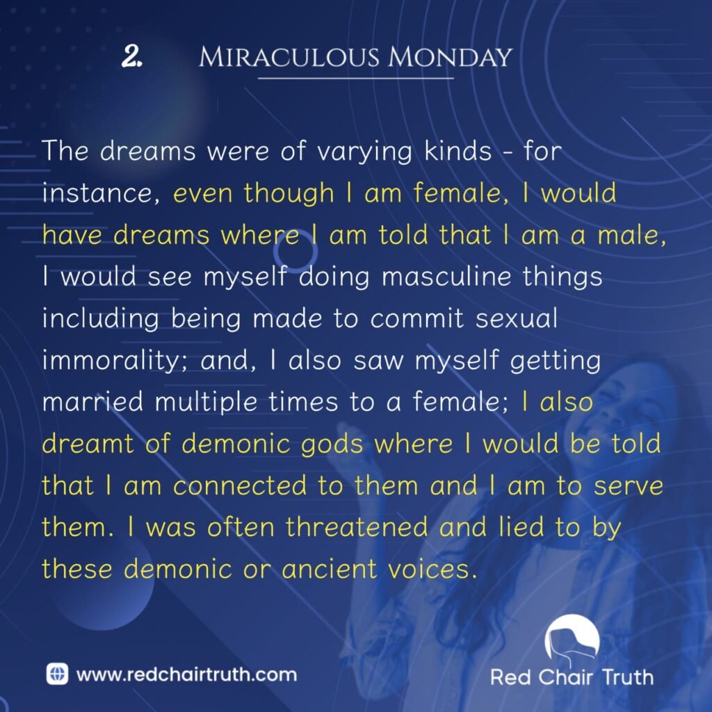 The dreams were of varying kinds – for instance, even though I am female, I would have dreams where I am told that I am a male, I would see myself doing masculine things including being made to commit sexual immorality; and, I also saw myself getting married multiple times to a female; I also dreamt of demonic gods where I would be told that I am connected to them and I am to serve them. I was often threatened and lied to by these demonic or ancient voices.