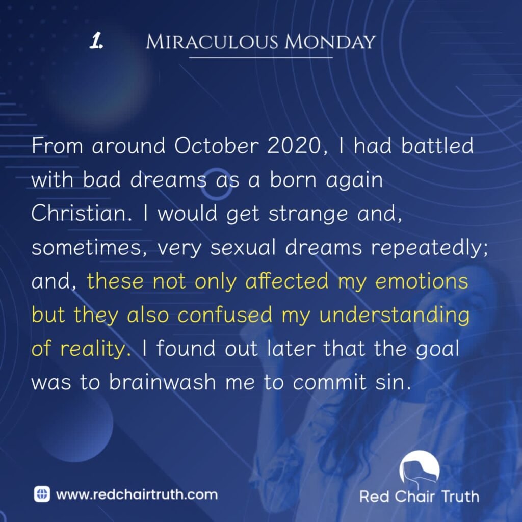 From around October 2020, I had battled with bad dreams as a born again Christian. I would get strange and, sometimes, very sexual dreams repeatedly; and, these not only affected my emotions but they also confused my understanding of reality. I found out later that the goal was to brainwash me to commit sin.