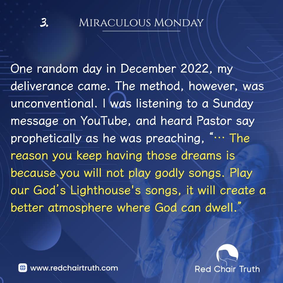 One random day in December 2022, my deliverance came. The method, however, was unconventional. I was listening to a Sunday message on YouTube, and heard Pastor say prophetically as he was preaching, “… The reason you keep having those dreams is because you will not play godly songs. Play our God’s Lighthouse’s songs, it will create a better atmosphere where God can dwell.”