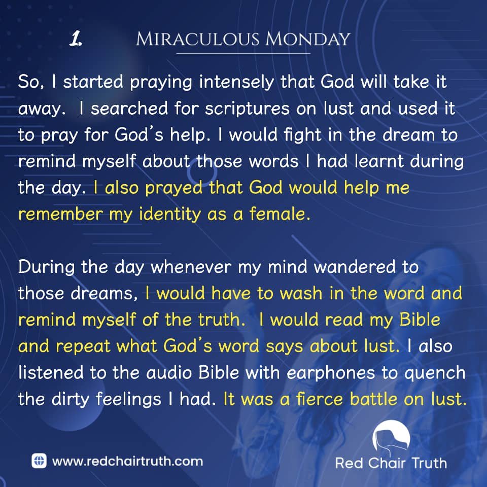 So, I started praying intensely that God will take it away. I searched for scriptures on lust and used it to pray for God’s help. I would fight in the dream to remind myself about those words I had learnt during the day. I also prayed that God would help me remember my identity as a female.