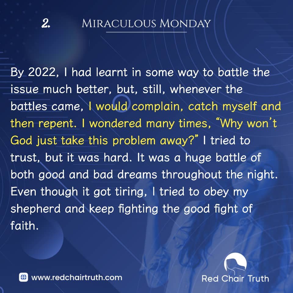 By 2022, I had learnt in some way to battle the issue much better, but, still, whenever the battles came, I would complain, catch myself and then repent. I wondered many times, “Why won’t God just take this problem away?” I tried to trust, but it was hard. It was a huge battle of both good and bad dreams throughout the night.