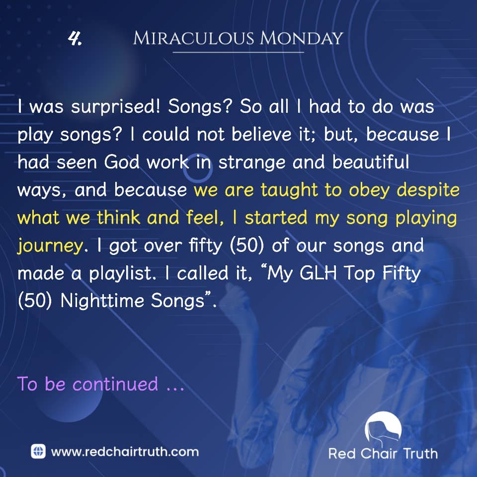I was surprised! Songs? So all I had to do was play songs? I could not believe it; but, because I had seen God work in strange and beautiful ways, and because we are taught to obey despite what we think and feel, I started my song playing journey. I got over fifty (50) of our songs and made a playlist. I called it, “My GLH Top Fifty (50) Nighttime Songs”.