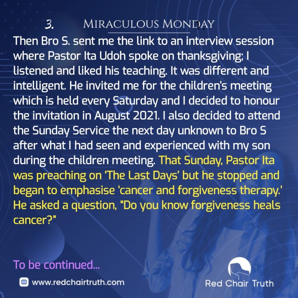 Then Bro S. sent me the link to an interview session where Pastor Ita Udoh spoke on thanksgiving: I listened and liked his teaching. It was different and intelligent. He invited me for the children’s meeting which is held every Saturday and I decided to honour the invitation in August 2021. I also decided to attend the Sunday Service the next day unknown to Bro S after what I had seen and experienced with my son during the children meeting. That Sunday, Pastor Ita was preaching on ‘The Last Days’ but he stopped and began to emphasise ‘cancer and forgiveness therapy.’ He asked a question, “Do you know forgiveness heals cancer?”