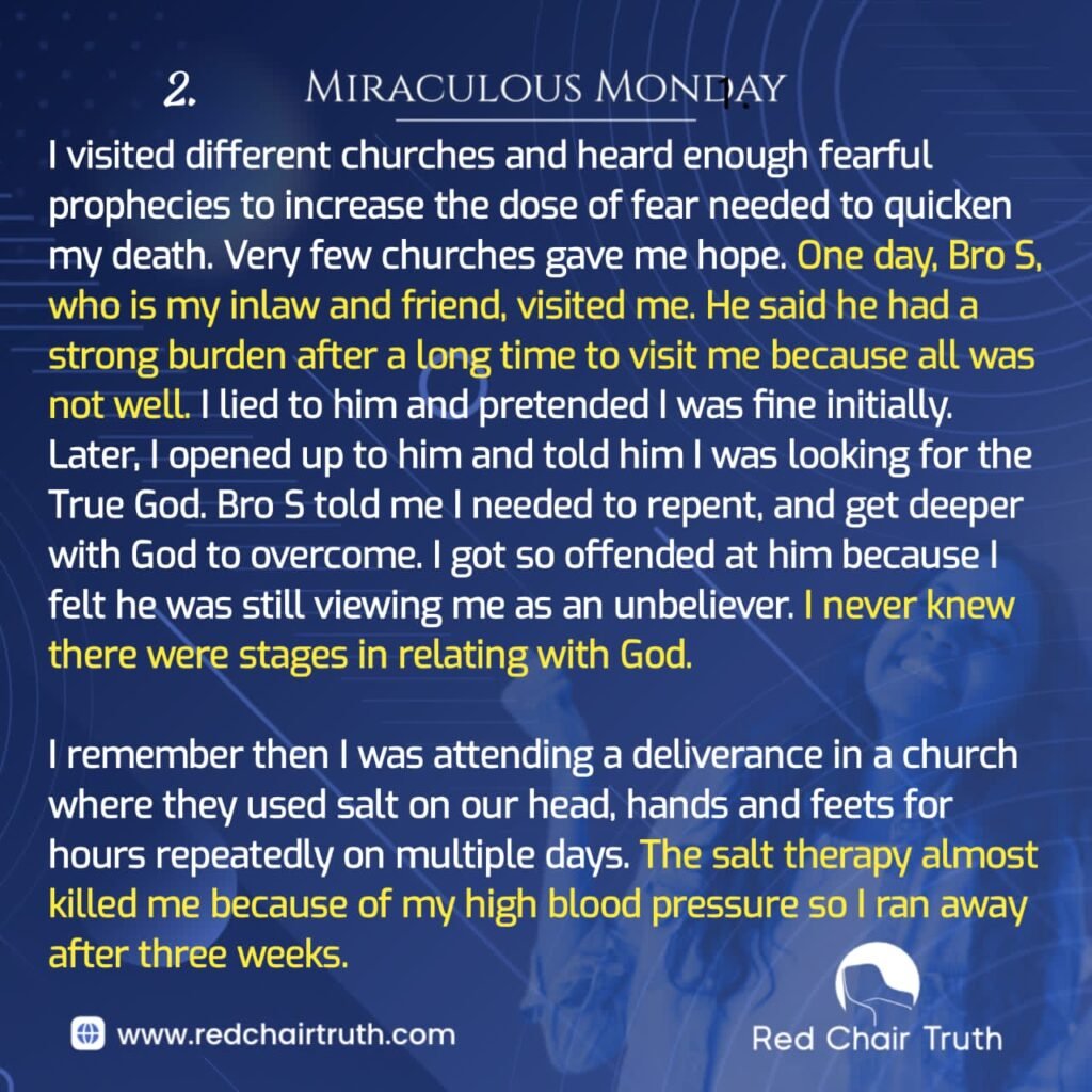 I remember then I was attending a deliverance in a church where they used salt on our head, hands and feets for hours repeatedly on multiple days. The salt therapy almost killed me because of my high blood pressure so I ran away after three weeks.