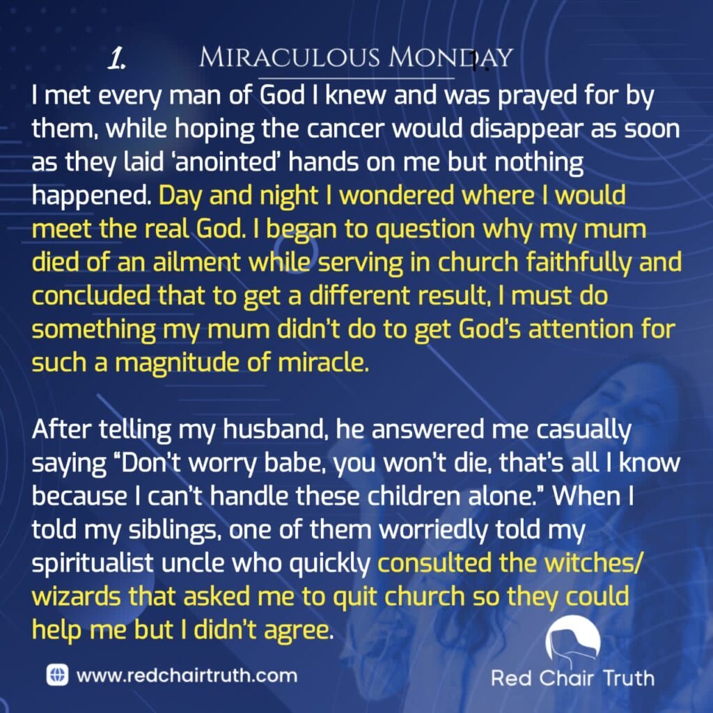 I met every man of God I knew and was prayed for by them, while hoping the cancer would disappear as soon as they laid ‘anointed’ hands on me but nothing happened. Day and night I wondered where I would meet the real God. I began to question why my mum died of an ailment while serving in church faithfully and concluded that to get a different result, I must do something my mum didn’t do to get God’s attention for such a magnitude of miracle.