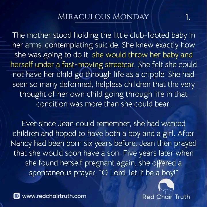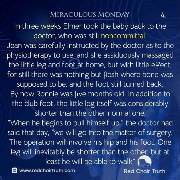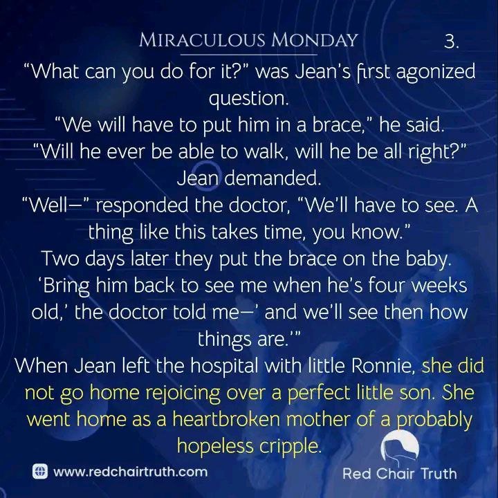 Two days later they put the brace on the baby. ‘Bring him back to see me when he’s four weeks old,’ the doctor told me-‘ and we’ll see then how things are.” When Jean left the hospital with little Ronnie, she did not go home rejoicing over a perfect little son. She went home as a heartbroken mother of a probably hopeless cripple.