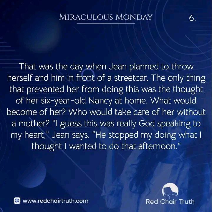 That was the day when Jean planned to throw herself and him in front of a streetcar. The only thing that prevented her from doing this was the thought of her six-year-old Nancy at home. What would become of her? Who would take care of her without a mother? “I guess this was really God speaking to my heart,” Jean says. “He stopped my doing what I thought I wanted to do that afternoon.”
