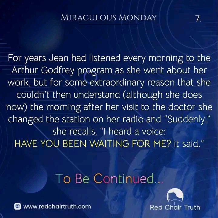 For years Jean had listened every morning to the Arthur Godfrey program as she went about her work, but for some extraordinary reason that she couldn’t then understand (although she does now) the morning after her visit to the doctor she changed the station on her radio and “Suddenly,” she recalls, “I heard a voice: HAVE YOU BEEN WAITING FOR ME? it said.”