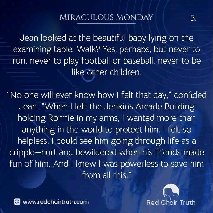 “No one will ever know how I felt that day,” confided Jean. “When I left the Jenkins Arcade Building holding Ronnie in my arms, I wanted more than anything in the world to protect him. I felt so helpless. I could see him going through life as a cripple-hurt and bewildered when his friends made fun of him. And I knew I was powerless to save him from all this.”