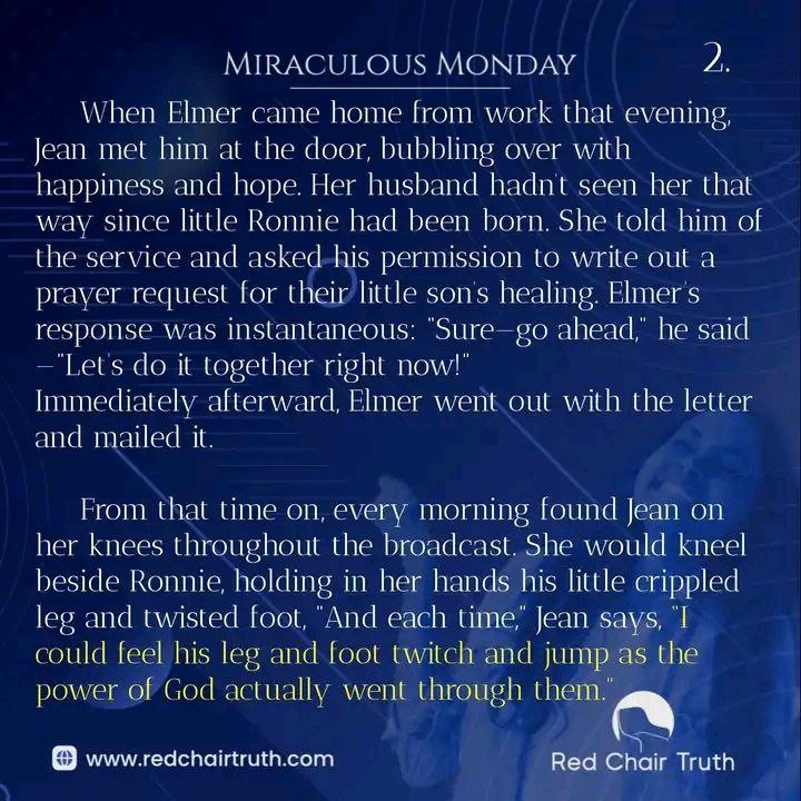 From that time on, every morning found Jean on her knees throughout the broadcast. She would kneel beside Ronnie, holding in her hands his little crippled leg and twisted foot, “And each time,” Jean says, “I could feel his leg and foot twitch and jump as the power of God actually went through them.”
