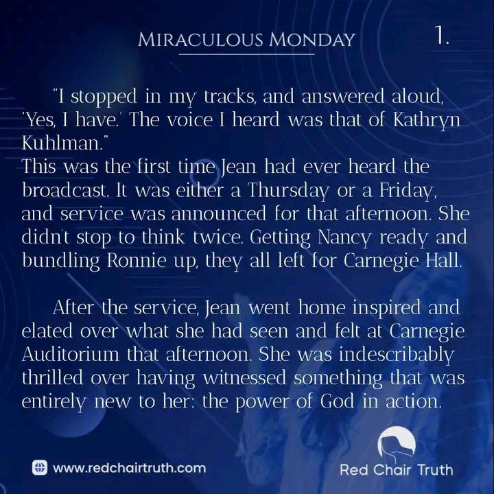 After the service, Jean went home inspired and elated over what she had seen and felt at Carnegie Auditorium that afternoon. She was indescribably thrilled over having witnessed something that was entirely new to her: the power of God in action.