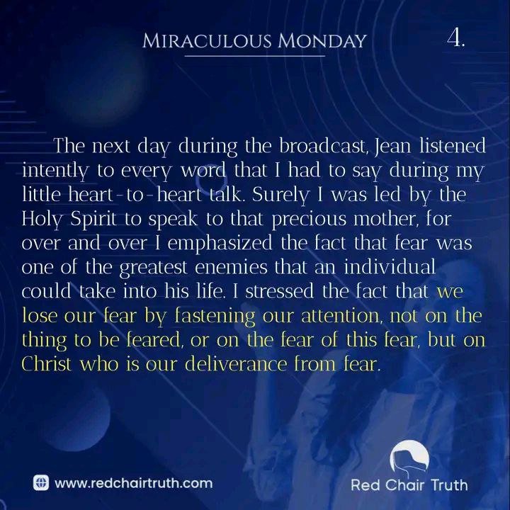 The next day during the broadcast, Jean listened intently to every word that I had to say during my little heart-to-heart talk. Surely I was led by the Holy Spirit to speak to that precious mother, for over and over I emphasized the fact that fear was one of the greatest enemies that an individual could take into his life. I stressed the fact that we lose our fear by fastening our attention, not on the thing to be feared, or on the fear of this fear, but on Christ who is our deliverance from fear.