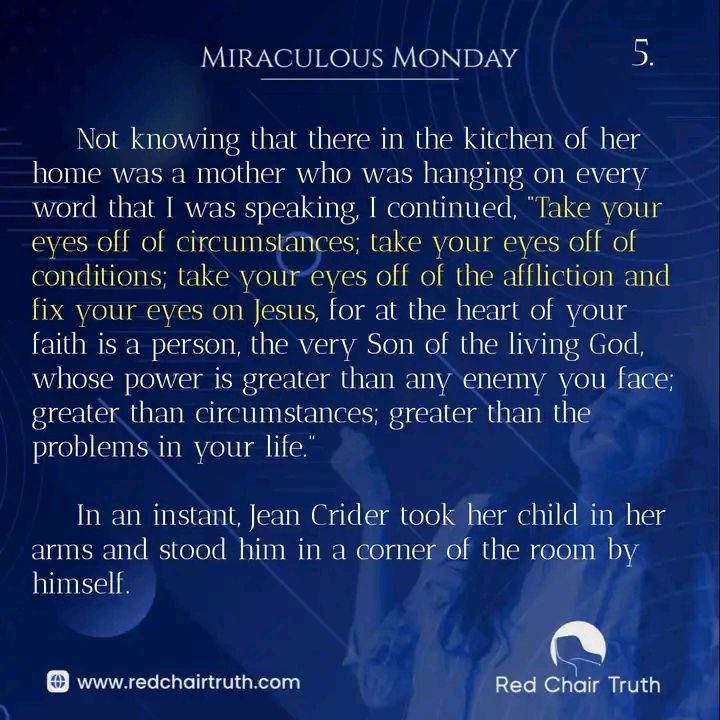 Not knowing that there in the kitchen of her home was a mother who was hanging on every word that I was speaking, I continued, “Take your eyes off of circumstances; take your eyes off of conditions; take your eyes off of the affliction and fix your eyes on Jesus, for at the heart of your faith is a person, the very Son of the living God, whose power is greater than any enemy you face; greater than circumstances; greater than the problems in your life.”