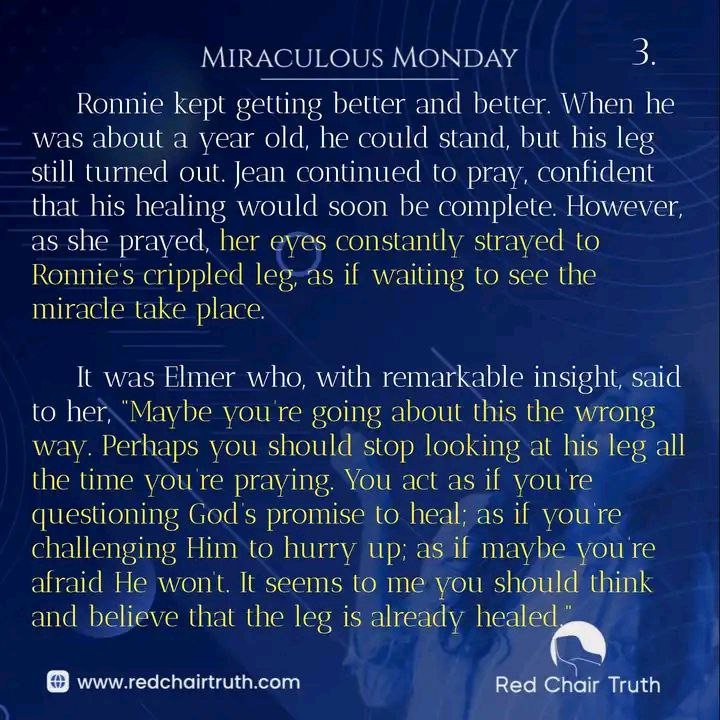 It was Elmer who, with remarkable insight, said to her, “Maybe you’re going about this the wrong way. Perhaps you should stop looking at his leg all the time you’re praying. You act as if you’re questioning God’s promise to heal; as if you’re challenging Him to hurry up; as if maybe you’re afraid He won’t. It seems to me you should think and believe that the leg is already healed.”