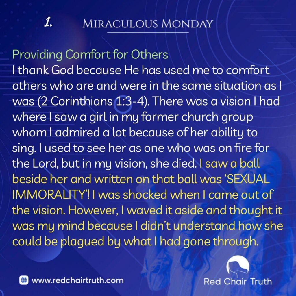 I thank God because He has used me to comfort others who are and were in the same situation as I was (2 Corinthians 1:3-4). There was a vision I had where I saw a girl in my former church group whom I admired a lot because of her ability to sing. I used to see her as one who was on fire for the Lord, but in my vision, she died. I saw a ball beside her and written on that ball was ‘SEXUAL IMMORALITY! I was shocked when I came out of the vision. However, I waved it aside and thought it was my mind because I didn’t understand how she could be plagued by what I had gone through.