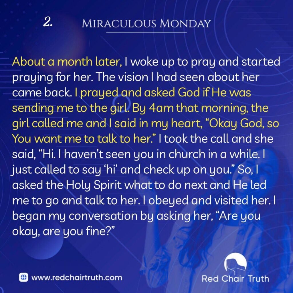 About a month later, I woke up to pray and started praying for her. The vision I had seen about her came back. I prayed and asked God if He was sending me to the girl. By 4am that morning, the girl called me and I said in my heart, “Okay God, so You want me to talk to her.” I took the call and she said, “Hi. I haven’t seen you in church in a while. I just called to say ‘hi’ and check up on you.” So, I asked the Holy Spirit what to do next and He led me to go and talk to her. I obeyed and visited her. I began my conversation by asking her, “Are you okay, are you fine?”