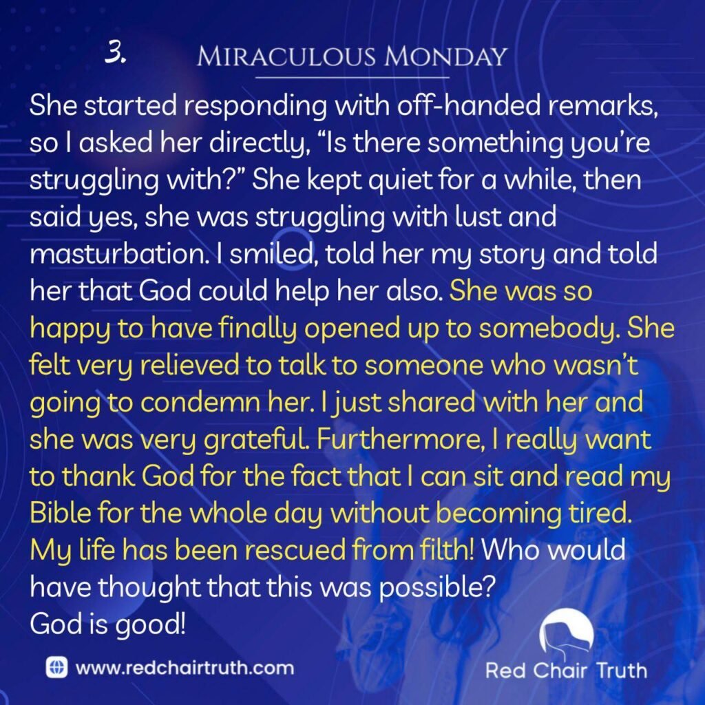 She started responding with off-handed remarks, so I asked her directly, “Is there something you’re struggling with?” She kept quiet for a while, then said yes, she was struggling with lust and masturbation. I smiled, told her my story and told her that God could help her also. She was so happy to have finally opened up to somebody. She felt very relieved to talk to someone who wasn’t going to condemn her. I just shared with her and she was very grateful. Furthermore, I really want to thank God for the fact that I can sit and read my Bible for the whole day without becoming tired. My life has been rescued from filth! Who would have thought that this was possible?