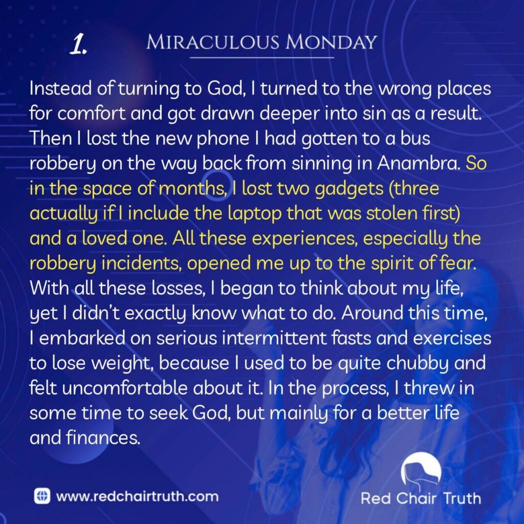 Instead of turning to God, I turned to the wrong places for comfort and got drawn deeper into sin as a result. Then I lost the new phone I had gotten to a bus robbery on the way back from sinning in Anambra. So in the space of months, I lost two gadgets (three actually if I include the laptop that was stolen first) and a loved one. All these experiences, especially the robbery incidents, opened me up to the spirit of fear. With all these losses, I began to think about my life, yet I didn’t exactly know what to do. Around this time, I embarked on serious intermittent fasts and exercises to lose weight, because I used to be quite chubby and felt uncomfortable about it. In the process, I threw in some time to seek God, but mainly for a better life and finances.