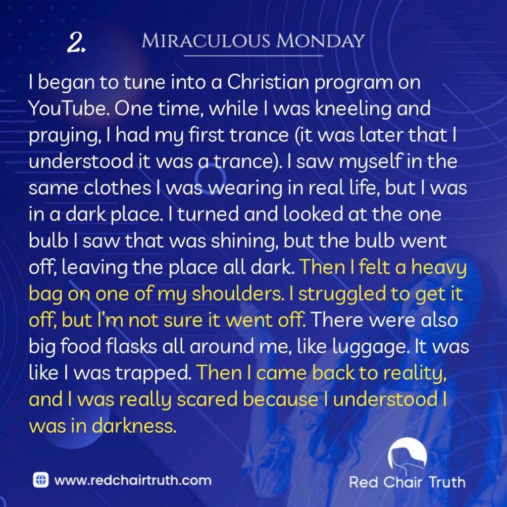 I began to tune into a Christian program on YouTube. One time, while I was kneeling and praying, I had my first trance (it was later that I understood it was a trance). I saw myself in the same clothes I was wearing in real life, but I was in a dark place. I turned and looked at the one bulb I saw that was shining, but the bulb went off, leaving the place all dark. Then I felt a heavy bag on one of my shoulders. I struggled to get it off, but I’m not sure it went off. There were also big food flasks all around me, like luggage. It was like I was trapped. Then I came back to reality, and I was really scared because I understood I was in darkness.