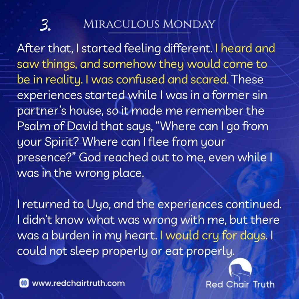 I returned to Uyo, and the experiences continued. I didn’t know what was wrong with me, but there was a burden in my heart. I would cry for days. I could not sleep properly or eat properly.