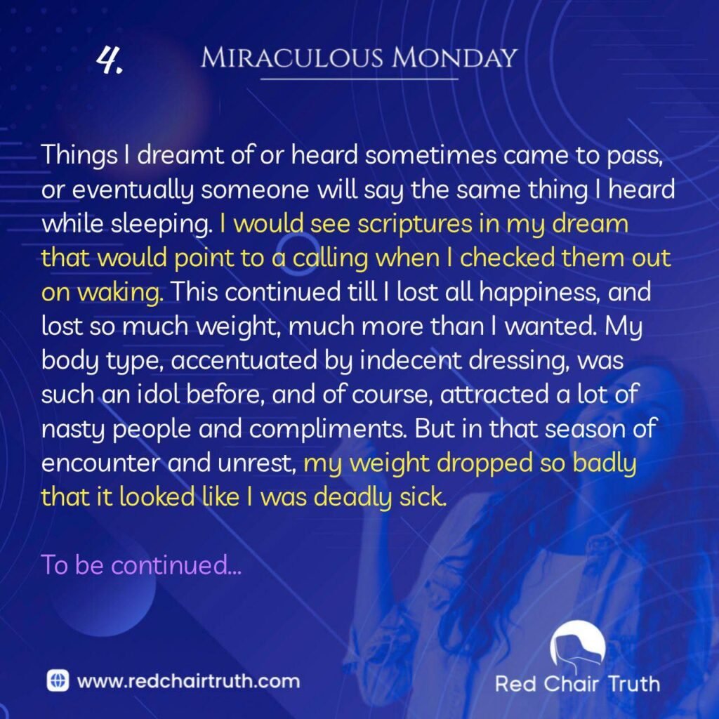Things I dreamt of or heard sometimes came to pass, or eventually someone will say the same thing I heard while sleeping. I would see scriptures in my dream that would point to a calling when I checked them out on waking. This continued till I lost all happiness, and lost so much weight, much more than I wanted. My body type, accentuated by indecent dressing, was such an idol before, and of course, attracted a lot of nasty people and compliments. But in that season of encounter and unrest, my weight dropped so badly that it looked like I was deadly sick.