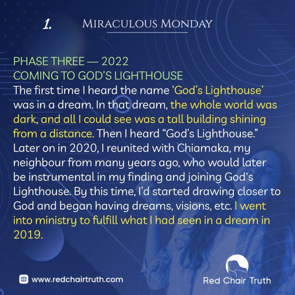 The first time I heard the name ‘God’s Lighthouse’ was in a dream. In that dream, the whole world was dark, and all I could see was a tall building shining from a distance. Then I heard “God’s Lighthouse.” Later on in 2020, I reunited with Chiamaka, my neighbour from many years ago, who would later be instrumental in my finding and joining God’s Lighthouse. By this time, I’d started drawing closer to God and began having dreams, visions, etc. I went into ministry to fulfill what I had seen in a dream in 2019.