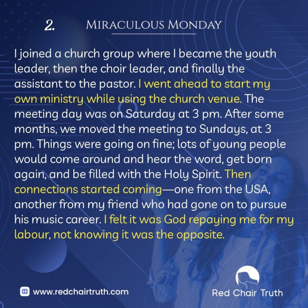 I joined a church group where I became the youth leader, then the choir leader, and finally the assistant to the pastor. I went ahead to start my own ministry while using the church venue. The meeting day was on Saturday at 3 pm. After some months, we moved the meeting to Sundays, at 3 pm. Things were going on fine; lots of young people would come around and hear the word, get born again, and be filled with the Holy Spirit. Then connections started coming-one from the USA, another from my friend who had gone on to pursue his music career. I felt it was God repaying me for my labour, not knowing it was the opposite.