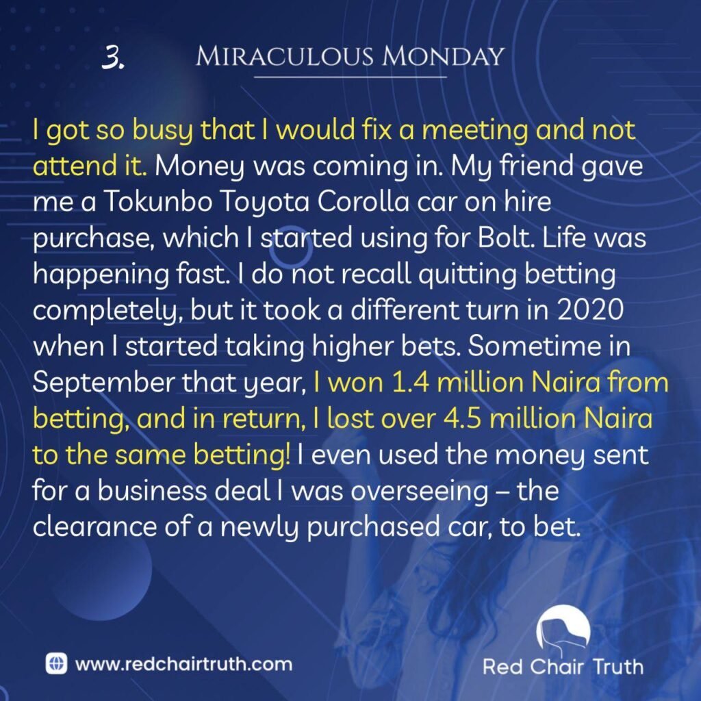 I got so busy that I would fix a meeting and not attend it. Money was coming in. My friend gave me a Tokunbo Toyota Corolla car on hire purchase, which I started using for Bolt. Life was happening fast. I do not recall quitting betting completely, but it took a different turn in 2020 when I started taking higher bets. Sometime in September that year, I won 1.4 million Naira from betting, and in return, I lost over 4.5 million Naira to the same betting! I even used the money sent for a business deal I was overseeing – the clearance of a newly purchased car, to bet.